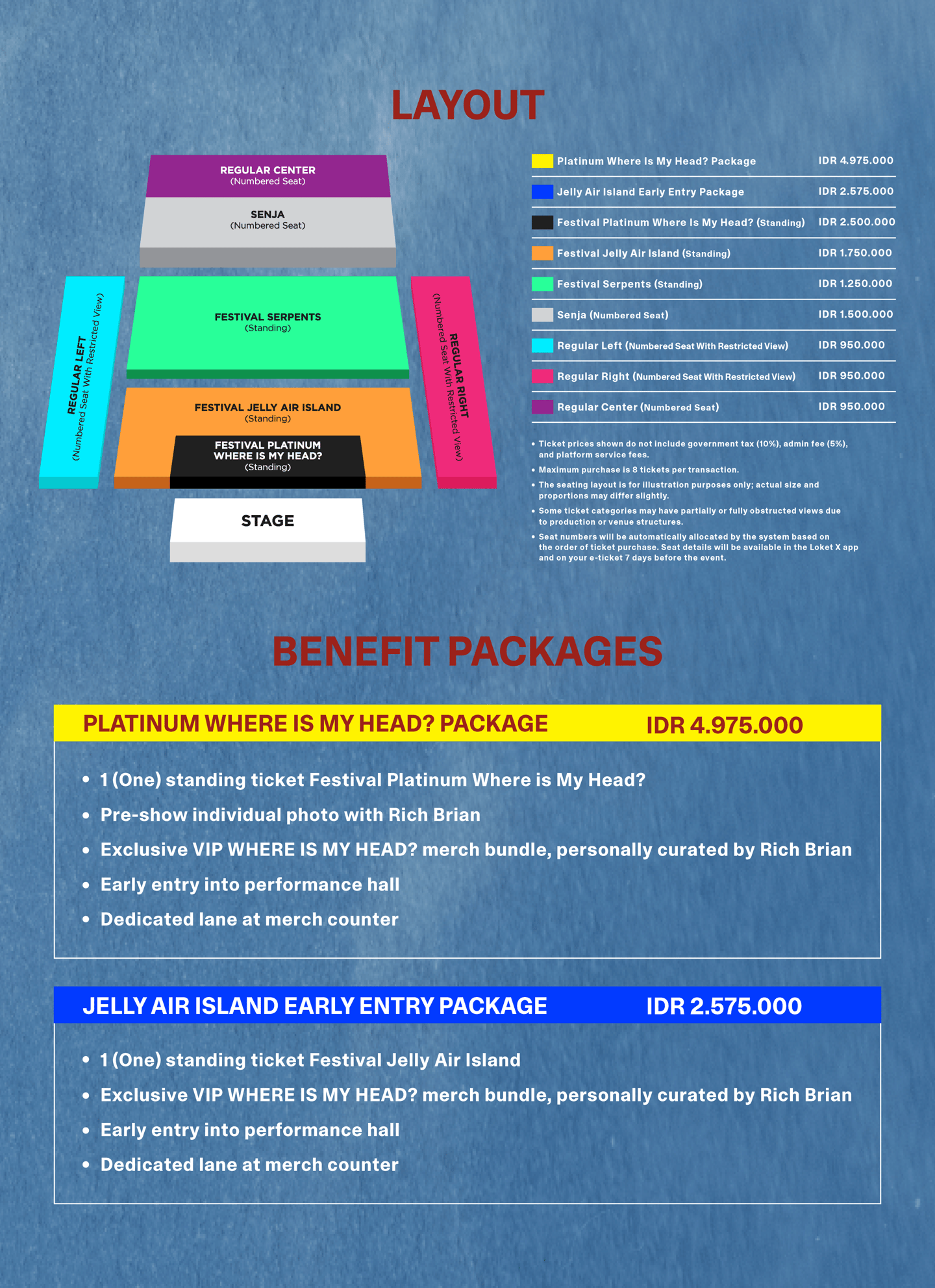 The seating/venue layout is for illustration purposes only; actual sizes and proportions may vary slightly.Maksimal pembelian adalah 8 tiket per transaksi.