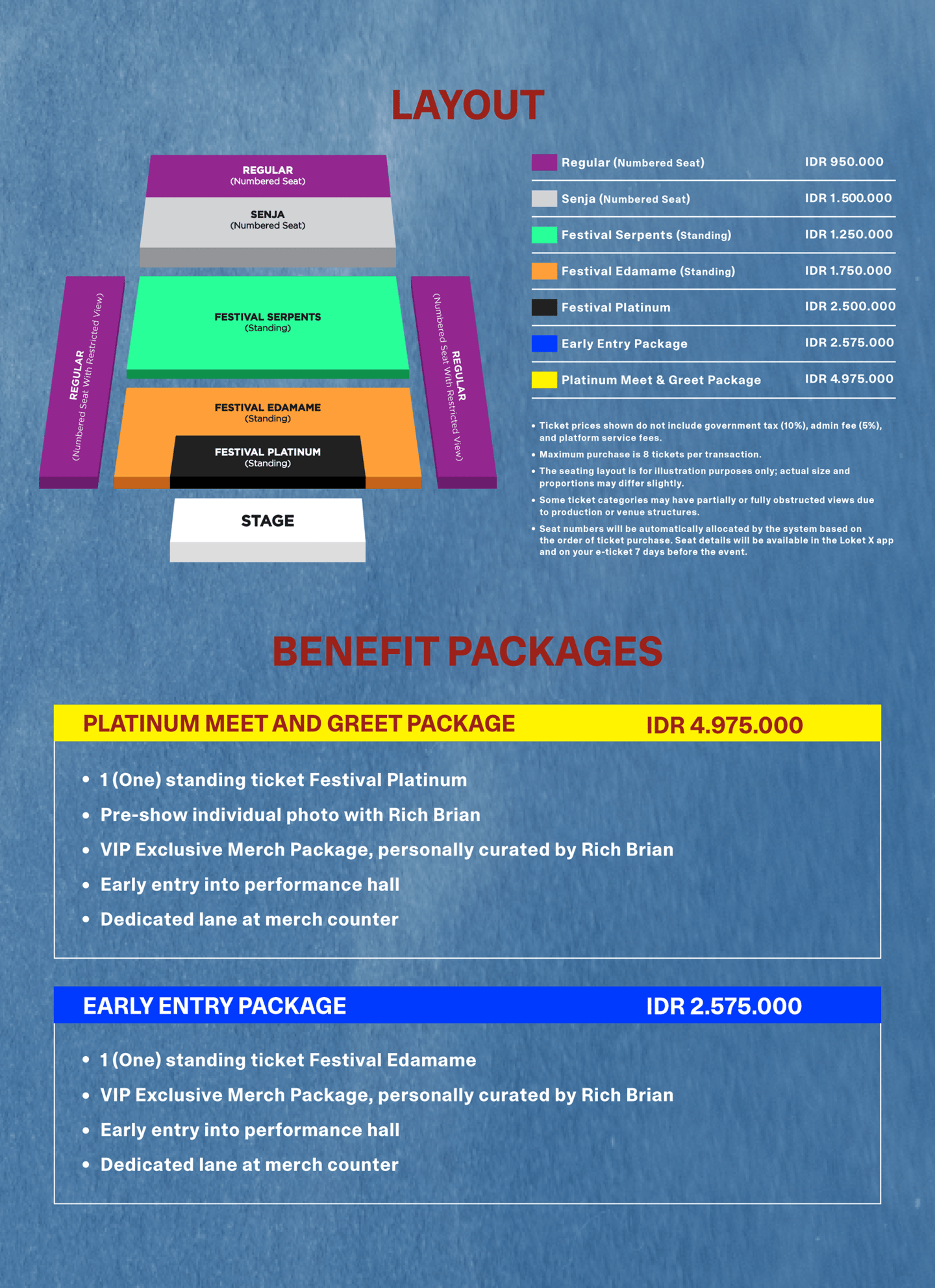 The seating/venue layout is for illustration purposes only; actual sizes and proportions may vary slightly.Maksimal pembelian adalah 8 tiket per transaksi.